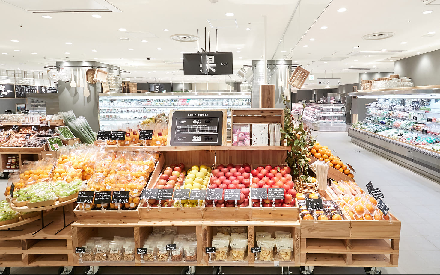 MUJI BASEから車でおよそ15分の場所にある大型店。無印良品の標準的な品揃えに加え、野菜や肉、魚、惣菜、グロサリーなど、食に関する商材全般を取り扱っています。京都の豊かな食材、食文化をお楽しみください。